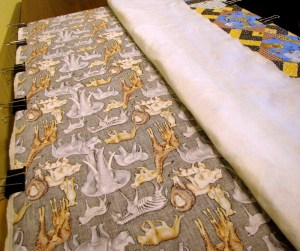 Unclamp and slide the quilt sandwich over. Reclamp the pin basted side. Move the unpinned quilt top and batting out of the way and clamp the unpinned backing. No stretching or wrinkles; just taut! Continue as before.
