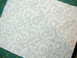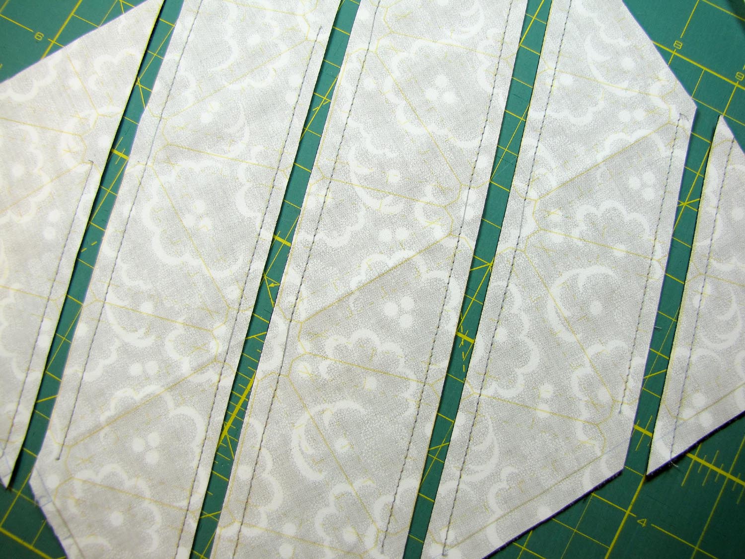 The above photo shows that the diagonal dash lines have been sewn.  How hard is that?  Just follow the lines!  The photo below shows some of the rotary cutting done.  Again, just follow the lines, only this time the lines are solid.