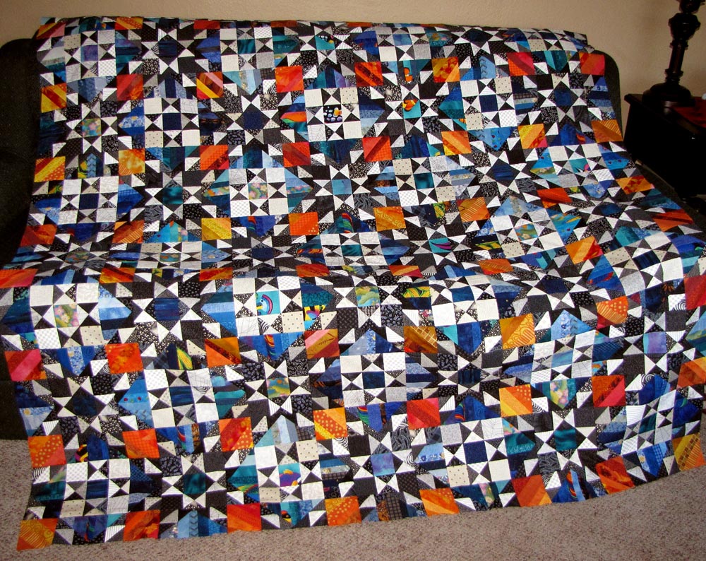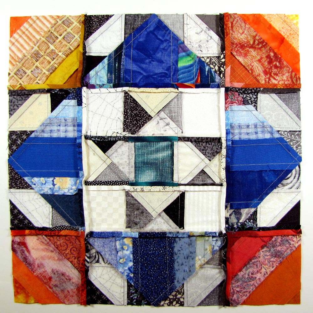 The entire flimsy is sewn and pressed. Hmmm…what’s up with that orange block? Is it turned the wrong direction? IT IS!