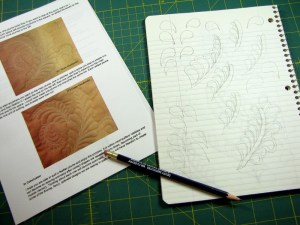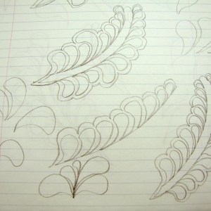 Month (lesson) 2 of SewCalGal’s Free Motion Quilt Challenge. Feathers. One of the best free motion quilters is the guest teacher this month, and she knows feathers! I printed out Diane Gaudynski’s lesson and started sketching out feathers.