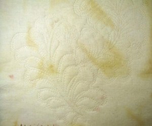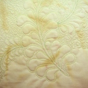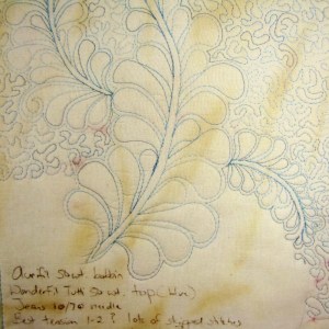 My first feather. I had problems with skipped stitches. I tried everything…changing needles, thread, tension, fabric. I came to the conclusion that my machine may be having an issue. I am determined. I end up with a tea-dyed muslin scrap, Aurifil 50wt in the bobbin, WonderFil Tutti 50 wt. in the top, a Schmetz 10/70 needle, and a tension of 1-2.