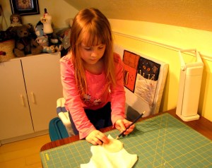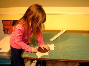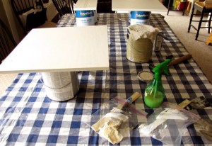 My dining table is set with a vinyl picnic table cloth (I use the cloth for fabric painting and dyeing sessions) and kitchen cabinets balanced on paint cans so that I can paint them.