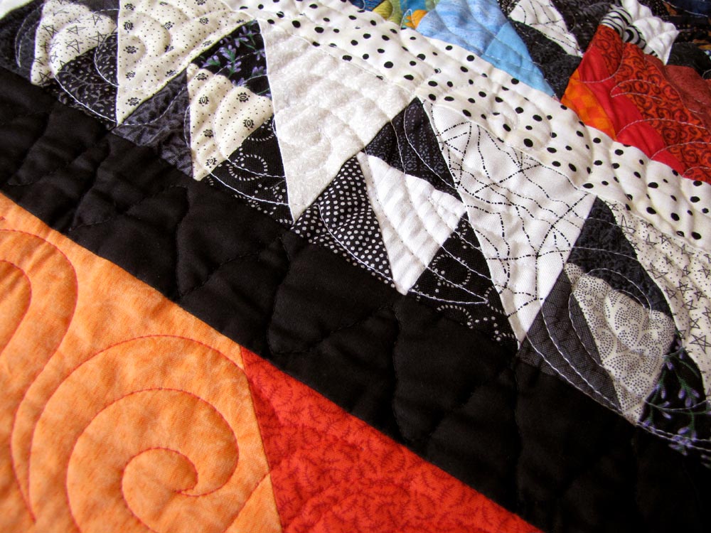 Because this is a scrappy quilt with so many prints, I am okay with the quilting. Anything really fancy would be difficult to see (although what we had discussed would’ve been great).