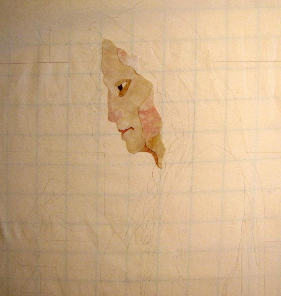 She is drawn on a muslin foundation and pinned to a gridded flannel board. I didn’t think about taking photos when I pinned her to this board.
